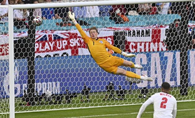 第30分钟,丹麦队进球了!禁区前的任意球机会,达姆斯高主罚的皮球绕过人墙直飞球门左上角,皮克福德鞭长莫及,英格兰队0-1落后丹麦队。这是三狮军团在本届欧洲杯上的第一个丢球。虽然丢球,但皮克福德的不失球时间已经超过了英格兰传奇门将班克斯。