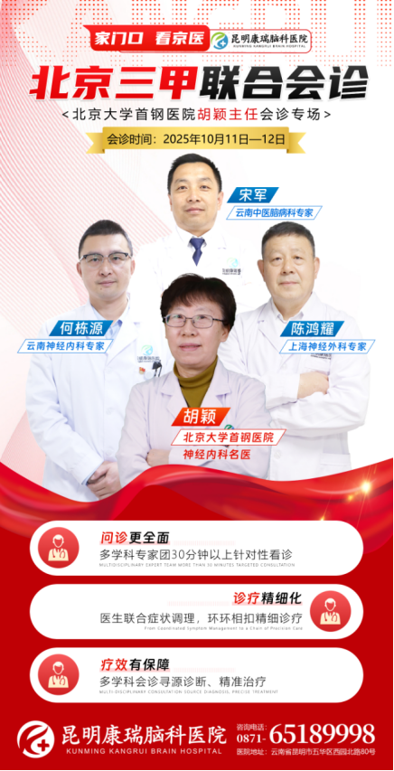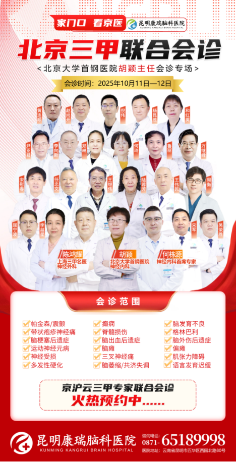 在追求高品质医疗服务的道路上,昆明康瑞脑科医院始终走在前列。为了让云南地区的广大患者能够享受到更加专业、权威的诊疗服务,昆明康瑞脑科医院特别邀请北京大学首钢医院神经内科专家胡颖主任、上海知名神经外科专家陈鸿耀主任,携手云南当地三甲医院的知名名医,于10月11日至12日举行京沪云专家MDT联合会诊活动。此次会诊活动,是昆明康瑞脑科医院为了践行“以患者为中心”的服务理念,积极响应患者对于优质医疗资源的需求而精心策划的。您无需远赴千里,京沪专家就在咱家门口!这不仅极大地节省了患者的时间和精力,更让患者能够在熟悉的环境中接受专业的治疗。预约现已开启,号源有限,预约从速哟~